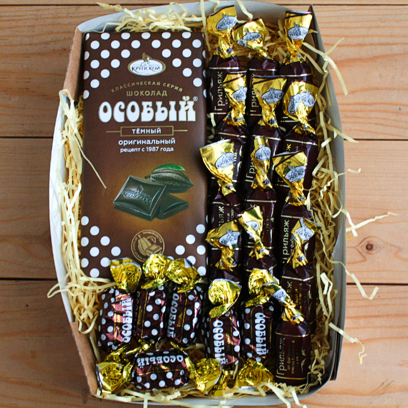 Подарочный набор шоколада от фабрики "Крупская": плитка шоколада "Особый" весом 90 грамм шоколад "Особый" в виде конфет - 10 шт грильяж в шоколаде в виде конфет - 10 шт