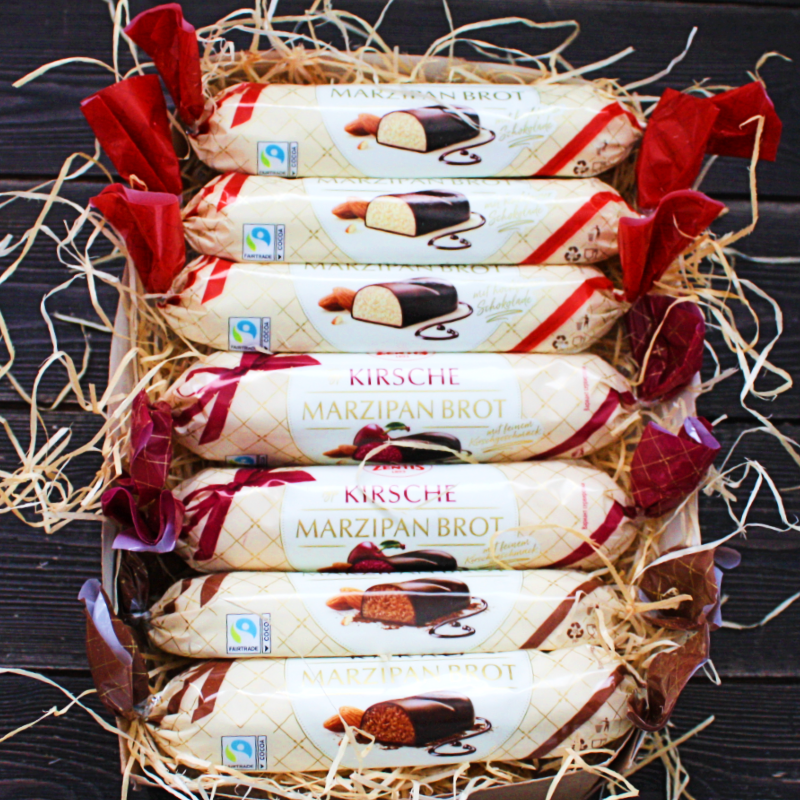 В составе: марципановая буханка с классическим вкусом - 3 шт. марципановая буханка со вкусом какао - 2 шт. марципановая буханка со вкусом вишни - 2 шт.